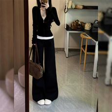 韩系高级感休闲套装女2025秋季显瘦黑色V领长袖吊带阔腿裤三件套