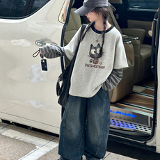 时尚牛仔阔腿裤套装女秋季新款假两件衬衫+窄版直筒裤休闲两件套
