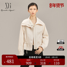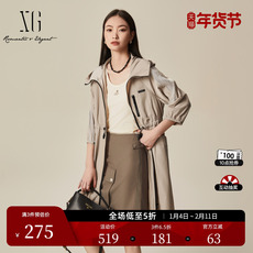 XG雪歌米白色中长款休闲风衣2025春季新款抽绳收腰设计长袖外套女