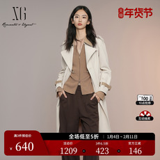 XG雪歌中长款双排扣休闲风衣2025春季新款白色通勤简约长袖外套女