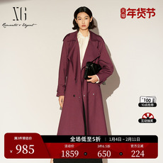 XG雪歌酒红色中长款休闲风衣2026春季新款翻领设计长袖风衣外套女