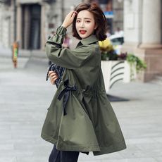 欧美女士抽绳长袖纽扣前襟休闲风格中长款风衣翻领系带收腰外套