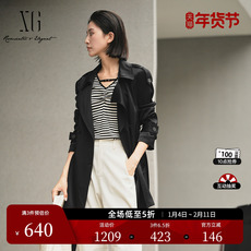 XG雪歌黑色系带设计休闲风衣2025秋季新款中长款收腰长袖外套女装