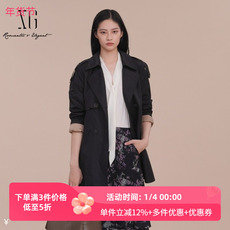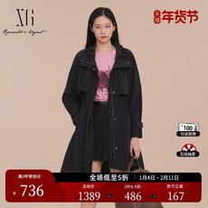 XG雪歌黑色抽褶设计长袖风衣2025春季新款中长款通勤休闲外套女装