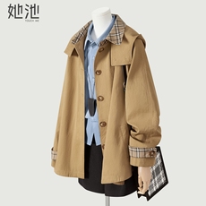 她池中长款风衣2026春季新款女装休闲风撞色格纹拼接连帽长袖外套