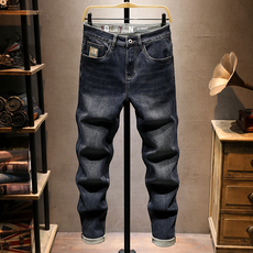 香港深蓝色高端男士牛仔裤潮流休闲小脚裤韩版修身简约青年长裤子
