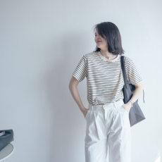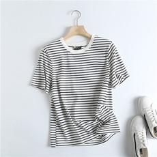 I676纯棉圆领条纹短袖上衣夏季新款2022百搭休闲韩版打底衫女t恤