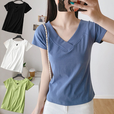春秋夏新款女装交叉V领 纯色修身简约短袖T恤衫上衣内搭纯棉上衣