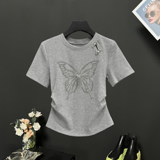 2025夏季新款时尚百搭优质纯棉短袖T恤女蝴蝶烫钻镂空捏褶上衣