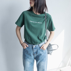 2025春夏新款简约韩系纯棉小字母短袖磨毛宽松墨绿色圆领T恤女潮