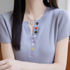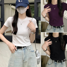 洋气螺纹短袖t恤女薄款夏季修身显瘦女装体恤短款外穿纯色上衣