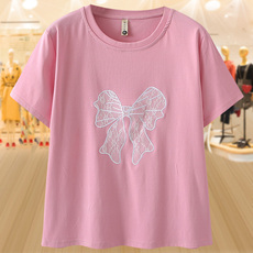 大码胖mm韩版显瘦遮肉黑色上衣正肩体恤圆领短袖T恤女夏季蝴蝶结