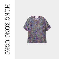 拉夏贝尔拼接印花插肩短袖T恤女夏季新款宽松显瘦撞色V领体恤上衣