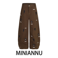 300斤大码胖mm小狗刺绣碎花牛仔裤春秋甜美裤子女宽松复古阔腿裤