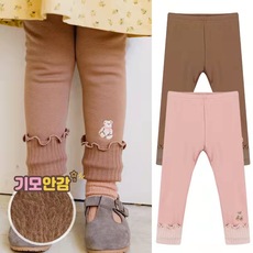 韩国bebezoo冬季新款女童加绒保暖打底裤小熊刺绣木耳边加绒长裤