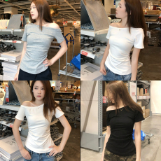 韩国新款斜肩纯色短袖打底衫女夏季短款修身显瘦性感露肩t恤上衣