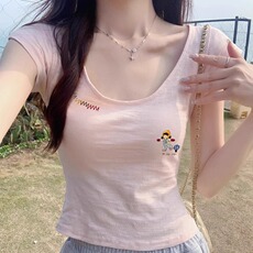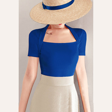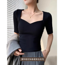 2022女装夏季薄新款打底衫纯棉方领T恤短袖修身显瘦别致上衣潮T恤