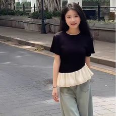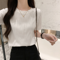 纯色圆领薄款拼接针织短袖t恤女夏季新款修身显瘦洋气打底上衣ins