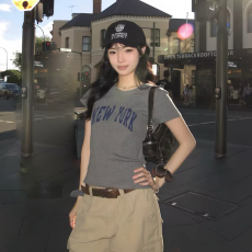 BM短袖T恤女2025新款夏季NEWYORK字母印花圆领短款修身显瘦上衣
