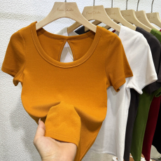 2025夏背镂空设计感大圆领正肩螺纹棉修身短袖T恤女显瘦百搭上衣