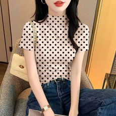 夏季半高领上衣女士短袖冰丝打底衫修身显瘦内搭小衫波点正肩t恤