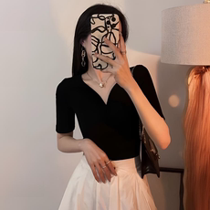 纯欲气质V领系带短袖T恤女夏季新款性感辣妹修身显瘦内搭针织上衣
