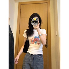 美式甜辣妹粉色正肩短袖t恤女夏季收腰显瘦修身小猫印花短款上衣