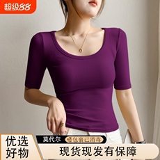 莫代尔女夏圆领短袖T恤修身显瘦内搭纯色简约打底衫外穿拼接上衣