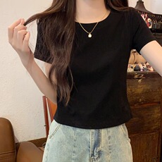 韩版黑色圆领正肩短袖t恤女2025夏季新款小个子修身显瘦短款上衣
