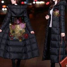 黑色刺绣亮面羽绒服连帽女白鸭绒冬高级感新款修身超长到脚踝6108