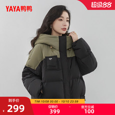 鸭鸭羽绒服女2025冬季短款小个子连帽立领拼接韩版修身鸭绒厚外套