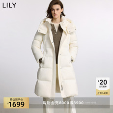 LILY2025冬新款女装简约90鹅绒连帽修身收腰米白色羽绒服外套长款