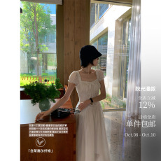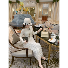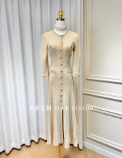 法式小众轻奢细闪金线圆领钩花针织钮扣收腰修身开叉长裙连衣裙