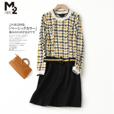 HONRN/红人春秋季v领长袖针织拼接修身显瘦毛衫连衣裙女HH11OL631