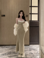 型色缤纷秋冬欧美设计感女人味针织连衣裙新款修身时尚鱼尾裙