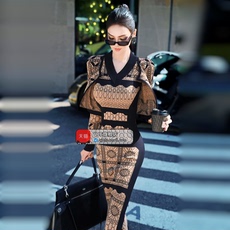 欧美性感辣妹修身微透度假吊带针织开叉露背连衣裙女巴厘岛针织裙