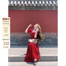 吃绿色菜【绯影】红色弹力中袖修身大摆针织显瘦连衣裙
