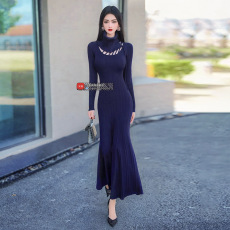 型色缤纷春秋季时尚针织鱼尾长裙新款气质修身收腰毛衣连衣裙