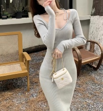 型色缤纷春秋装打底针织包臀裙新款气质修身性感镂空连衣裙