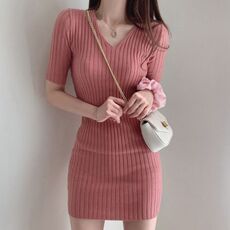 韩雨嘉米色v领针织连衣裙女秋冬气质长袖打底内搭裙修身收腰短裙