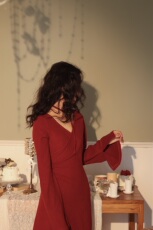 喵吉 复古法式V领长袖修身收腰小个子长款红色内搭针织连衣裙女秋