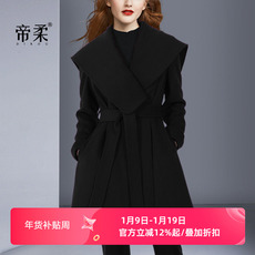 帝柔减龄大翻领黑色毛呢外套2025秋冬新品羊毛呢子大衣修身系带女