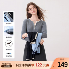 因由 假两件圆领羊毛打底衫女修身内搭长袖T恤百搭撞色套头针织衫