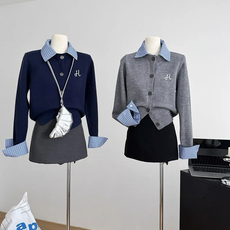 学院风拼接格子假两件针织开衫女显白复古藏青色毛衣外套2025秋冬