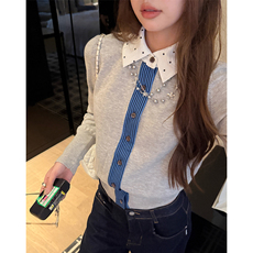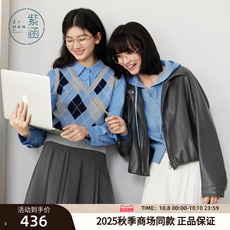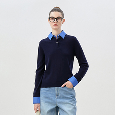 紫涵假两件衬衫领套头针织衫女2025秋季新款撞色菱格拼接长袖毛衣