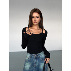 ousph 黑色性感露肩假两件针织上衣女2024秋季套头修身显瘦打底衫