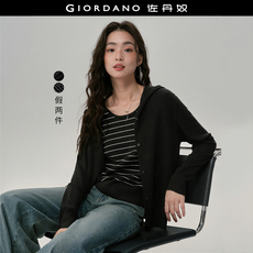 设计师款佐丹奴秋冬新款假两件条纹内里连帽套头针织衫女18355216