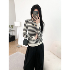 秋冬新款女装条纹拼色半高领长袖毛针织衫宽松套头打底衫假两件