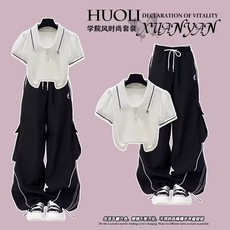 学院风洋气套装女夏装时尚大童polo领短袖T恤工装阔腿裤两件套潮