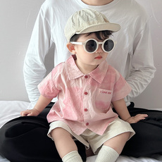 韩版婴儿衣服夏装男宝宝衬衣套装夏季男童粉色衬衫短裤两件套薄款